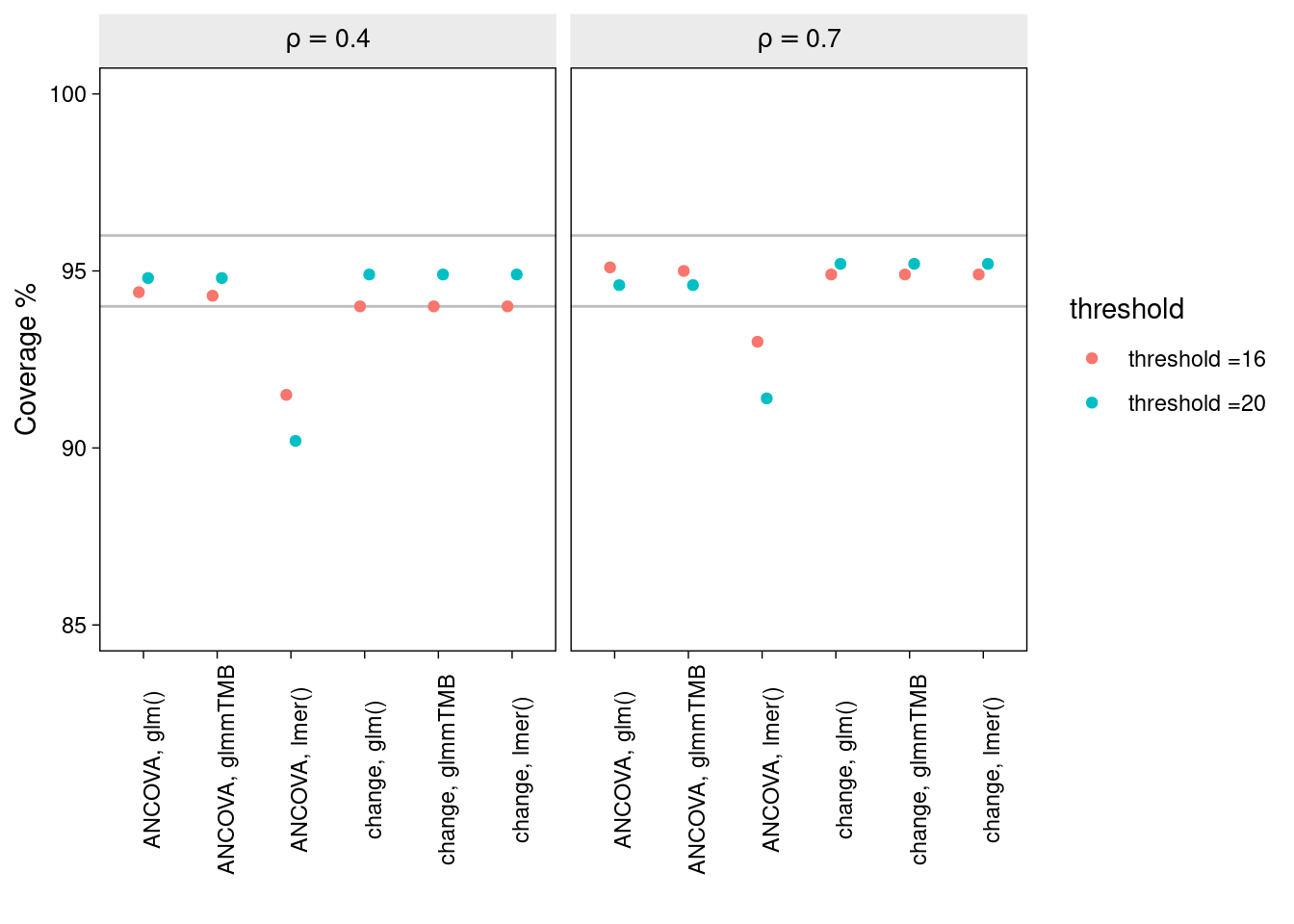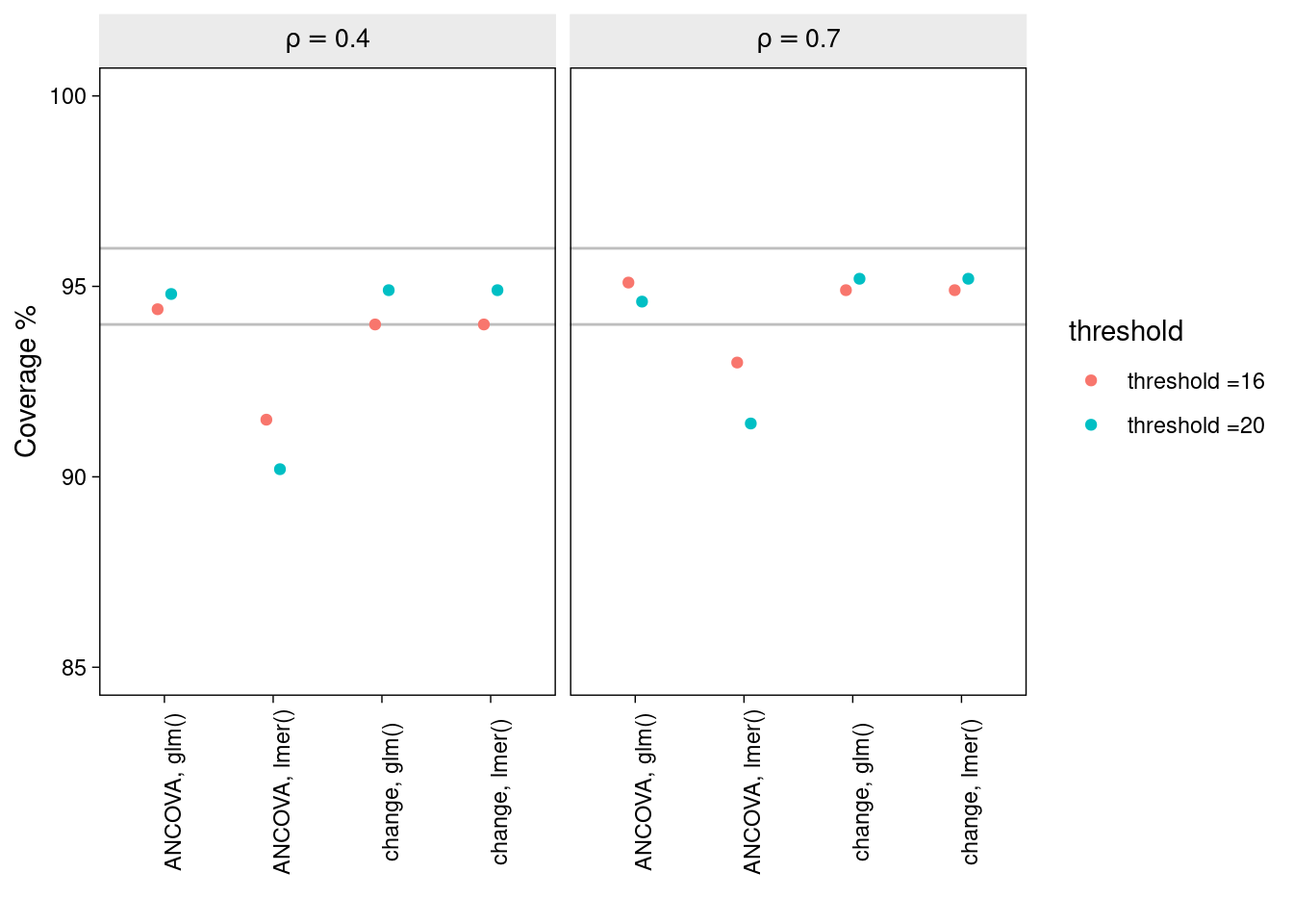 Under most conditions, each of the methods produces intervals with nominal coverage. Notably, however, the ANCOVA LMM method tends to produce confidence intervals which are somewhat too narrow. And this seems to be worse in cases of low pre-post correlation and when the degree of baseline truncation is large.