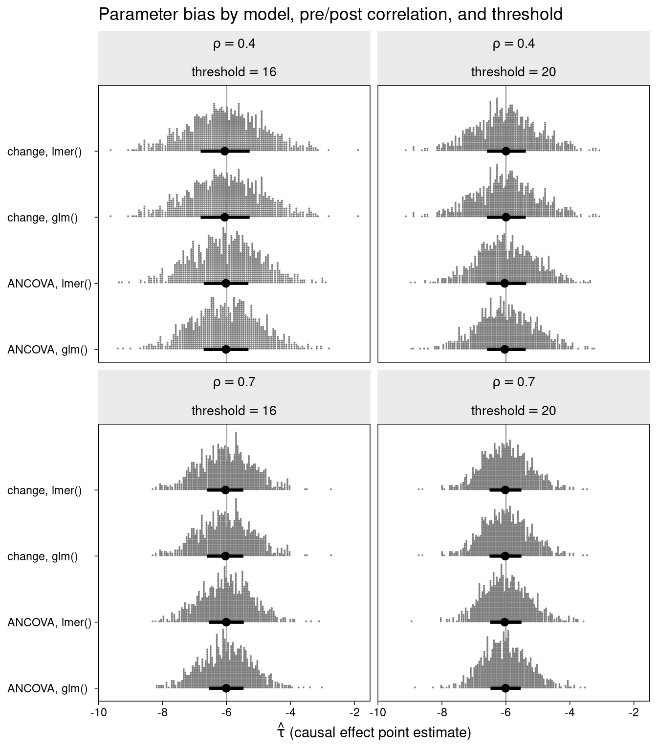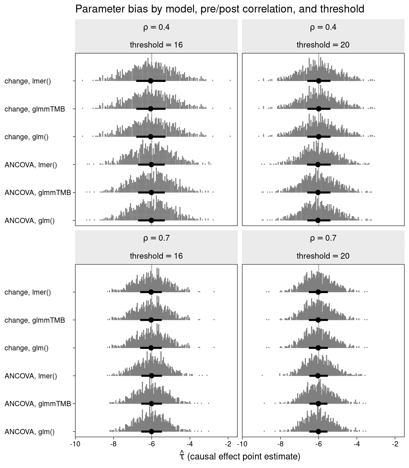 Why truncation appears to produce overly confident inferences from the ANCOVA LMM in particular is, to me, somewhat of a mystery. One possibility is that the error variance at baseline is considerably lower than at post test, and this heteroscedasticity is causing problems for the ANCOVA LMM in particular.
