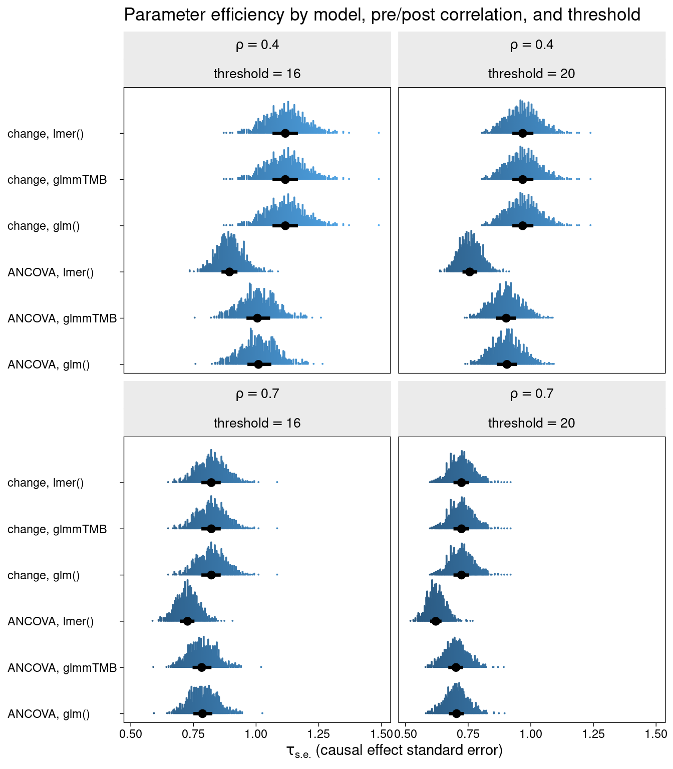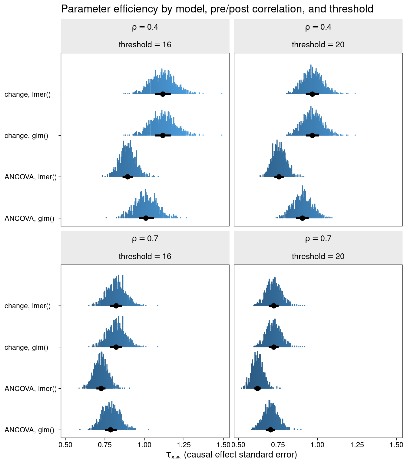 It seems that the classic change LMM, the distributional change LMM, and the glm change model are all equivalent in terms of efficiency.They are clearly outperformed by their ANCOVA counterparts in all cases.